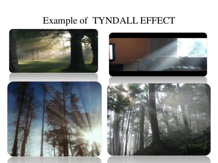 Similarly when a strong beam of light is concentrated on a colloidal. Tyndall effect can also be observed when sunlight passes through a canopy of a dense forest. According to the tyndall effect, light is reflected off of particles that are slightly below or near the size of a wavelength of light. Give any ten examples of tyndall effect. What are you looking for?